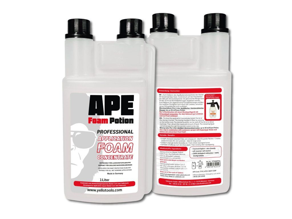 Z 1 litru koncentrátu APE FoamPotion připravíte přibližně 20 litrů aplikační pěny, což z něj dělá velmi ekonomické řešení pro profesionální instalace PPF fólií.