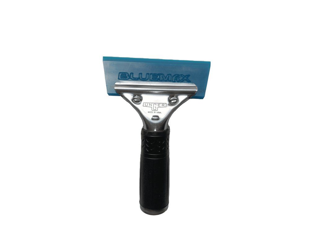 Nerezový držák s rukojetí potažený černou gumou TIN GT050A s modrou, úhlovou, výměnnou stěrkou TIN GT117A která má zešikmenou stírací hranu pro lepší přístup do rohů. Tento set slouží pro vytlačování kapaliny při instalaci fólií.