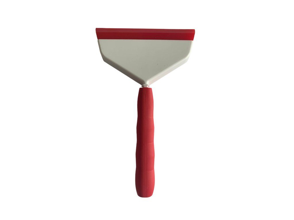 Plastový držák s červenou rukojetí (šířka 12,5cm)a výměnnou gumovou stěrkou (měkká)pro čištění skla před instalací okenních fólií.